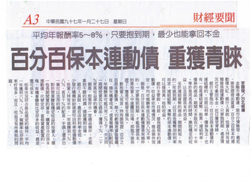 金融市場動盪、股市行情險惡,最近,掛保證商品當道,百分之百保本的連動債火紅,銀行人員說,投資人持有這類掛保證連動債,只要抱到期,最差情況也可拿回本金,近日廣受青睞。